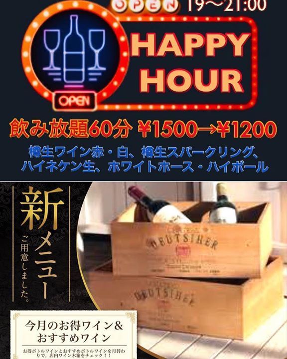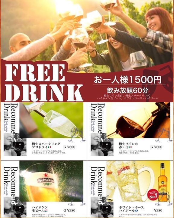 イタリア🇮🇹ヴェネツィア直送の樽生ワイン赤・白、樽生スパークリング、ハイネケン生ビール、ホワイトホース・ハイボールの当店人気のドリンクを60分お一人様¥1500で飲み放題。