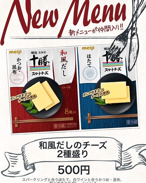 写真は1コイン(¥500)酒肴シリーズの新メニュー「和風だしの小さなチーズ盛り」。かつお昆布とほたての和風だし、スパークリングか白ワインとどうぞ🥂