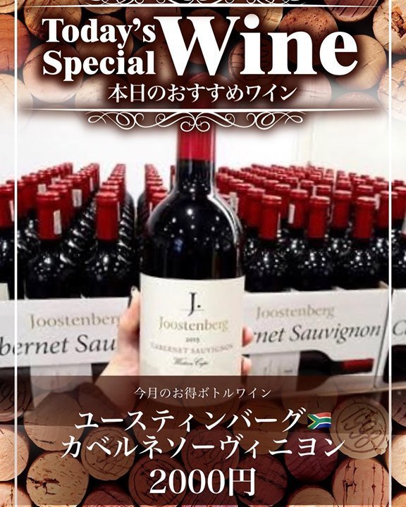 今月のお得ワインは南アフリカ産🇿🇦赤ワイン「ユースティンバーグ・カベルネソーヴィニヨン」。お値段は¥2000!!お得です!!
