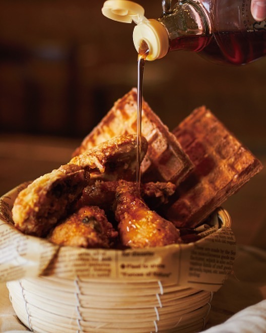 そして、日本でも徐々にトレンドになりつつある「ワッフル&チキン」を。ワッフルの上にフライドチキンを乗せ、メープルシロップをドバドバかけて食べるスタイル。前にアメリカ旅行の時に食べた事はありますが確認の為に改めて。感想はお店でワインでも飲みながら話しましょう〜笑