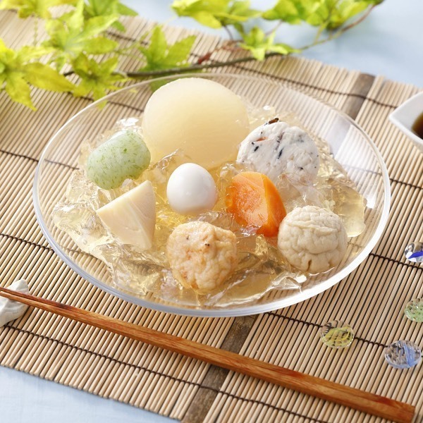 昆布と鰹の効いた合わせだしをジュレ状に仕立てました。